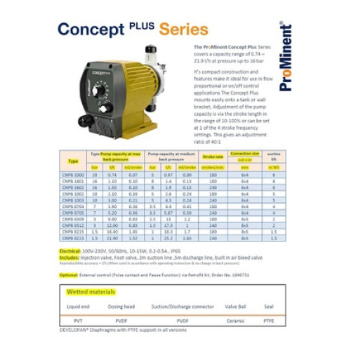 PROMINENT ปั๊มจ่ายสารเคมี รุ่น CONCEPT PLUS (CNPB) ปั๊มคลอรีน/ปั๊มจ่ายสารสำหรับงานระบบน้ำและอุตสาหกรรม มาตรฐานเยอรมัน ทนเคมีสูง ควบคุมปริมาณการจ่ายได้แม่นยำ เหมาะสำหรับการเติมคลอรีน น้ำยาฆ่าเชื้อ สารปรับสภาพน้ำ และสารเคมีทั่วไปในงานบำบัดน้ำ