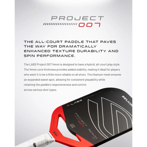 Selkirk LABS Project 007 Pickleball Paddle (Epic 14mm) ไม้พิคเคิลบอลระดับพรีเมียมสำหรับผู้เล่นที่ต้องการ “บาลานซ์ครบคอร์ท” ทั้งบุกและรับในไม้เดียว โดดเด่นด้วยเทคโนโลยีผิวหน้าที่ทนทานเป็นพิเศษเพื่อคงประสิทธิภาพการสร้างสปินได้ยาวนาน พร้อมคอร์ 14mm ที่ช่วยเพิ่มความนิ่ง ความเสถียร และความสม่ำเสมอของทุกช็อต