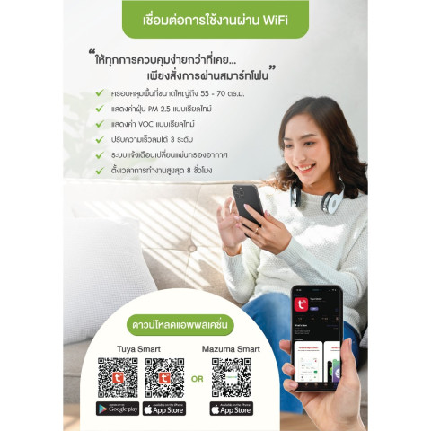 ควบคุมผ่านแอป ได้สะดวกผ่าน MazumaSmart หรือ Tuya Smart