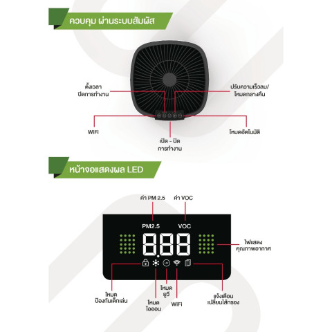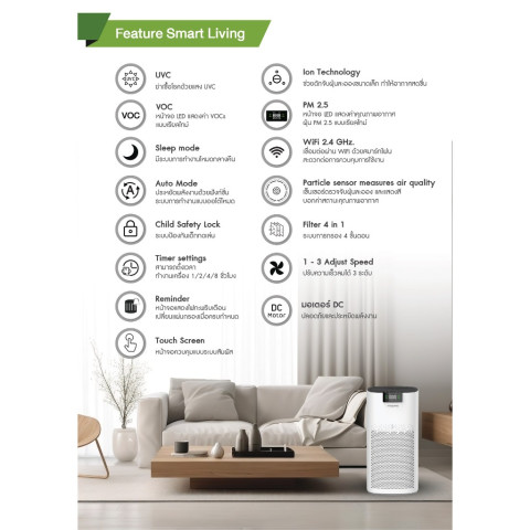 ระบบกรองหลายชั้น + แสง UVC ภายในเครื่อง ช่วยดักจับ/ลดแบคทีเรีย ไวรัส ฝุ่น สารก่อภูมิแพ้ และกลิ่นไม่พึงประสงค์