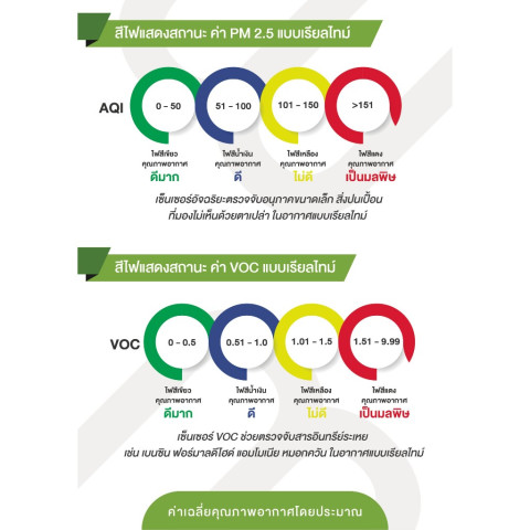 หน้าจอ LED แสดงค่า PM2.5 และ VOC พร้อมไฟบอกคุณภาพอากาศแบบเรียลไทม์ อ่านชัดเจน