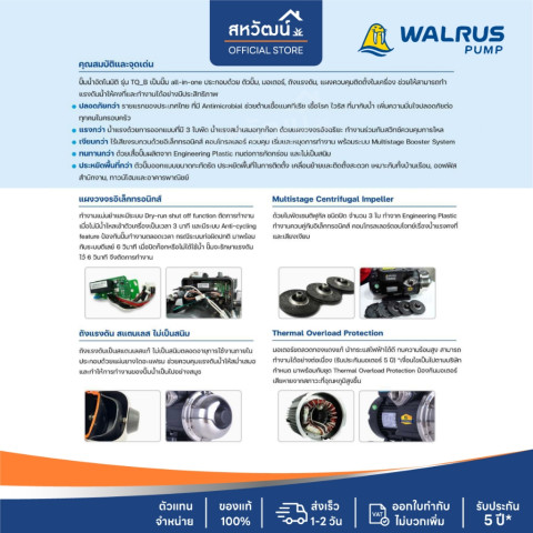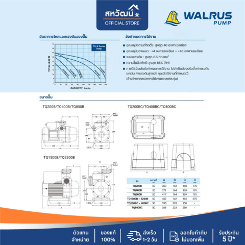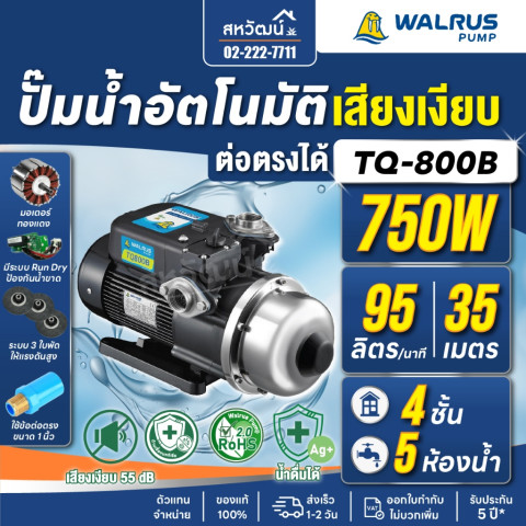 🔥ส่งฟรี ส่งด่วน🔥 WALRUS ปั๊มน้ำอัตโนมัติแรงดันคงที่ 3 ใบพัด รุ่น TQ800B / TQ800BC (1 นิ้ว 750 วัตต์) สำหรับบ้าน 4 ชั้น / ประมาณ 5 ห้องน้ำ ให้น้ำแรงสม่ำเสมอทั้งบ้านด้วยระบบควบคุมอัตโนมัติ เปิด-ปิดตามการใช้งานจริง พร้อมดีไซน์เงียบพิเศษเพียง 55 dB เหมาะกับบ้านสมัยใหม่ที่ต้องการความสบายและความเสถียรของแรงดันน้ำ