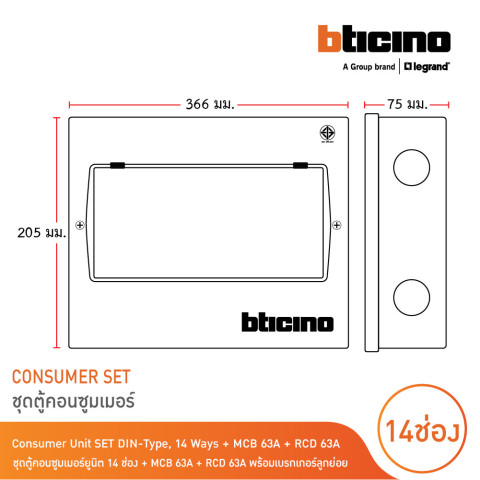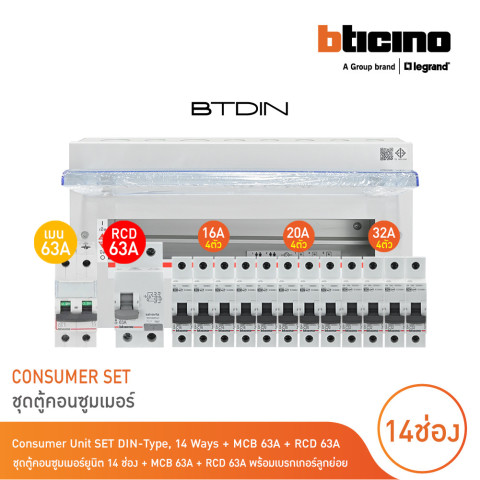 BTicino ชุดตู้คอนซูมเมอร์ยูนิต BTDIN 14 ช่อง (แบบเกาะราง) พร้อมเมน MCB 2P 63A + RCD 2P 63A และเบรกเกอร์ลูกย่อย ชุดตู้คอนซูมเมอร์ยูนิตแบบ DIN Rail ที่รวมอุปกรณ์สำคัญมาให้ครบ พร้อมใช้งานสำหรับบ้านพักอาศัย อาคาร หรือระบบไฟฟ้าแรงดันต่ำ ช่วยจัดระเบียบวงจรไฟฟ้าให้เป็นสัดส่วน เพิ่มความปลอดภัยในการป้องกันกระแสเกิน/ไฟรั่วได้อย่างมั่นใจ ด้วยมาตรฐานที่เชื่อถือได้และผ่านการรับรอง มอก.