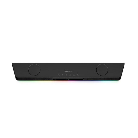 CREATIVE Sound Blaster Katana V2 (Model: MF8380) ซาวด์บาร์เกมมิ่งระดับพรีเมียมพร้อมซับวูฟเฟอร์ แรงสะใจด้วยกำลังขับ 126W RMS (Peak 252W) และไฟ RGB เพิ่มบรรยากาศโต๊ะคอมให้โดดเด่นยิ่งขึ้น มาพร้อมเทคโนโลยี Super X-Fi Ultra DSP เพื่อมิติเสียงสมจริงรอบทิศทาง ทั้งเล่นเกม ดูหนัง หรือฟังเพลง เชื่อมต่อง่ายครบเครื่องด้วย Bluetooth 5.0, HDMI ARC, Optical, AUX, USB-C ตอบโจทย์ทั้งคอนโซลและพีซีในชุดเดียว