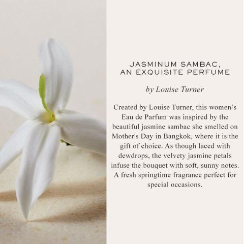 สำหรับกลิ่น Jasminum Sambac นักปรุงน้ำหอม Louise Turner ได้แรงบันดาลใจจากมะลิซัมบัคที่งดงามที่สุดในความทรงจำ—กลิ่นที่เธอได้สัมผัสในวันแม่ ณ กรุงเทพฯ ซึ่งดอกมะลิคือของขวัญแห่งความหมาย ความละเอียดนุ่มของกลีบมะลิที่เหมือนประดับด้วยละอองน้ำค้าง ถ่ายทอดเป็นโทนหอม “นุ่ม-สว่าง-อบอุ่น” เหมือนแสงอาทิตย์อ่อนในช่อดอกไม้