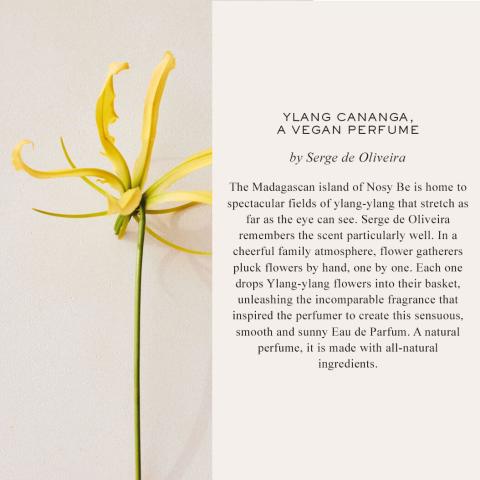 แรงบันดาลใจของ YLANG CANANGA มาจากทุ่งกระดังงาบนเกาะ Nosy Be แห่งมาดากัสการ์ ที่คนเก็บดอกไม้ค่อย ๆ เด็ดด้วยมือทีละดอกอย่างประณีต กลิ่นหอมที่ฟุ้งขึ้นจากตะกร้าดอกไม้ได้กลายเป็นความทรงจำของนักปรุงน้ำหอม Serge de Oliveira และถูกถ่ายทอดเป็น Eau de Parfum ที่ให้ความรู้สึก sensual, smooth และ sunny—อบอุ่น นุ่มลื่น และเปล่งประกายอย่างเป็นธรรมชาติ