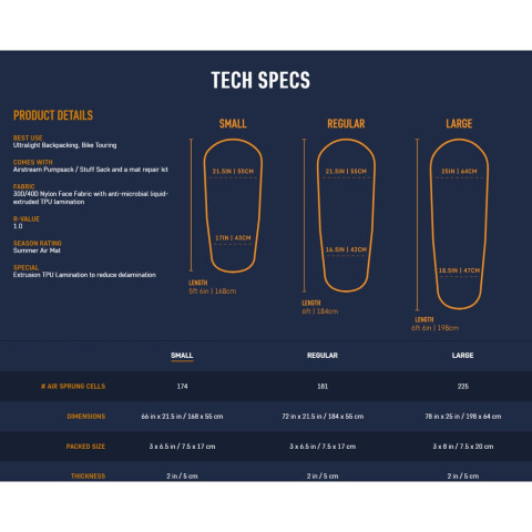 ด้วยเทคโนโลยี Air Sprung Cell™ แบบเซลล์ชั้นเดียวความละเอียดระดับกลาง ช่วยกระจายน้ำหนักและรองรับสรีระได้ดี ให้ความนุ่มสบายในขนาดที่พับเก็บได้เล็ก เหมาะอย่างยิ่งสำหรับ Backpacker, Bikepacking, Adventure racer หรือสายท่องเที่ยวที่อยากเบาแต่ยังอยากนอนดี