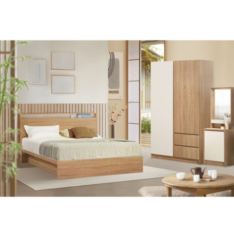 LOOMS ชุดห้องนอน ขนาด 5 ฟุต รุ่น Kyoto สีโซลิดโอ๊คตัดสีขาว (Japanese Style / Minimal & Muji) เติมบรรยากาศห้องนอนให้เรียบง่าย อบอุ่น และดูดีแบบญี่ปุ่น ด้วยโทนไม้สบายตา ดีไซน์คลีนเข้ากับห้องได้หลายสไตล์ พร้อมฟังก์ชันจัดเก็บที่ออกแบบมาให้ใช้พื้นที่คุ้มค่า อยู่แล้วรู้สึกผ่อนคลายเป็นระเบียบยิ่งขึ้น ในราคา 5,800.00 บาท