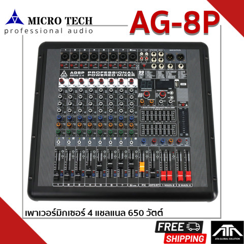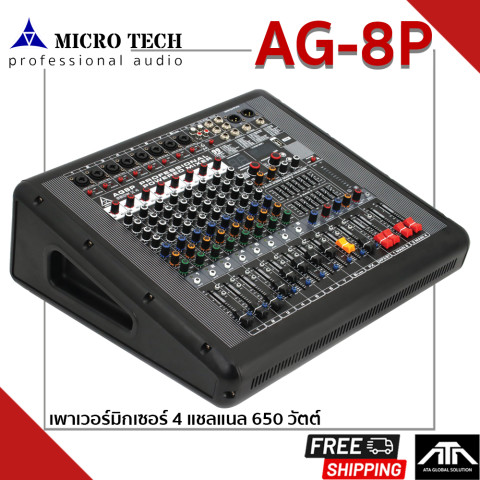 MICROTECH Power Mixer AG-8P 650W x 4CH เพาเวอร์มิกเซอร์กำลังขับสูงที่ออกแบบมาเพื่อ “งานเสียงจริงจัง” ทั้งงานอีเวนต์ เวที งานประชุม วงดนตรี และระบบเสียงกลางแจ้ง ด้วยแอมป์ Class D ประสิทธิภาพสูง ให้พลังเสียงแน่น คมชัด พร้อม ครอสโอเวอร์ในตัว ช่วยจัดการย่านความถี่และรองรับการใช้งานแบบมีซับวูฟเฟอร์ได้อย่างลงตัว