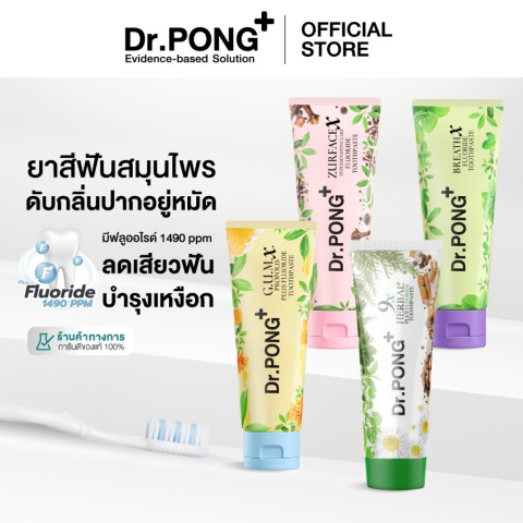 Dr.PONG FLUORIDE TOOTHPASTE ยาสีฟันสมุนไพรผสมฟลูออไรด์ 4 สูตร ตอบโจทย์ปัญหาช่องปากแบบเลือกได้ตามความต้องการ ช่วยดูแลทั้งความสะอาด ลมหายใจ และสุขภาพเหงือก เหมาะสำหรับใช้เป็นประจำทุกวัน เพื่อรอยยิ้มมั่นใจมากขึ้น
