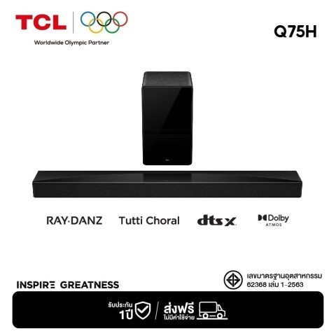 [ใหม่] TCL Sound Bar รุ่น Q75H ซาวด์บาร์ระดับมืออาชีพ พลังเสียงรวมสูงสุด 620W มอบประสบการณ์เสียงกระหึ่มสมจริงรอบทิศทางด้วยระบบ 5.1.2 Channel รองรับทั้ง Dolby Atmos และ DTS Virtual:X เติมเต็มความบันเทิงให้เหมือนอยู่ในโรงภาพยนตร์ พร้อม Subwoofer ไร้สาย เบสหนักแน่นลงลึกถึง 45Hz และเชื่อมต่อสะดวกด้วย Bluetooth 5.1 ดีไซน์ยาว 1054 มม. วางเข้ากับทีวีได้อย่างลงตัว