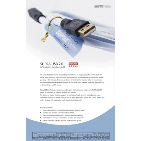 Supra USB 2.0 A-B Blue 4M สายสัญญาณ USB คุณภาพสูงจากประเทศสวีเดน ออกแบบมาเพื่อการส่งสัญญาณที่ “สะอาด รวดเร็ว และนิ่ง” เหมาะอย่างยิ่งสำหรับผู้ใช้งาน USB DAC และสายทางเครื่องเสียงคอมพิวเตอร์ (Computer Audiophile) ที่ต้องการยกระดับคุณภาพเสียงจากการฟังเพลงผ่านพอร์ต USB อย่างจริงจัง ในราคา 5,670.00 บาท