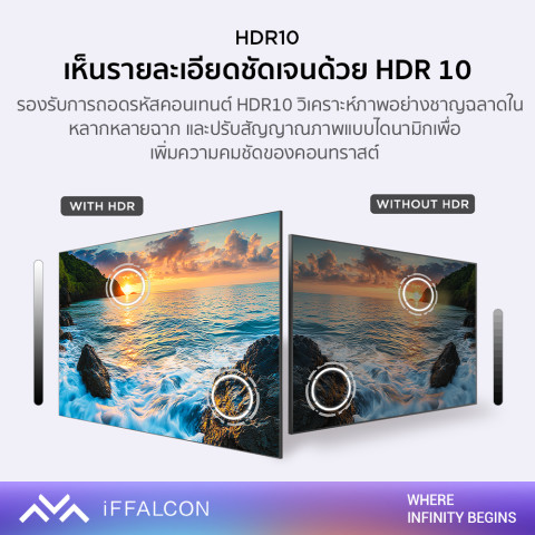 ความละเอียด HD 720P ให้ภาพคมชัด ดูรายการโปรดได้สบายตา เหมาะกับห้องนอน คอนโด หรือพื้นที่จำกัดHDR10 เพิ่มมิติของภาพ