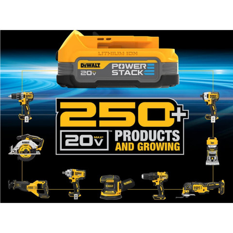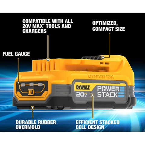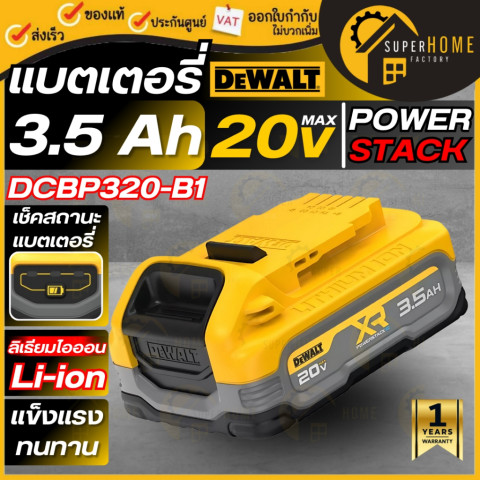 DEWALT แบตเตอรี่ Powerstack 20V MAX* รุ่น DCBP034-B1 (1.7Ah) / DCBP320-B1 (3.5Ah) / DCBP520-B1 (5.0Ah) แบตลิเธียมไอออนประสิทธิภาพสูง พร้อมเทคโนโลยี Powerstack ใช้งานยาวขึ้นได้ถึง 2 เท่า ตอบโจทย์งานช่าง งานซ่อมบำรุง และงานก่อสร้างที่ต้องการพลังต่อเนื่อง ใช้ได้กับเครื่องมือไร้สายระบบ 20V MAX* ของ DEWALT