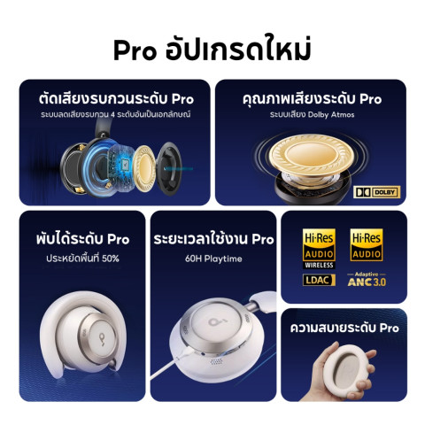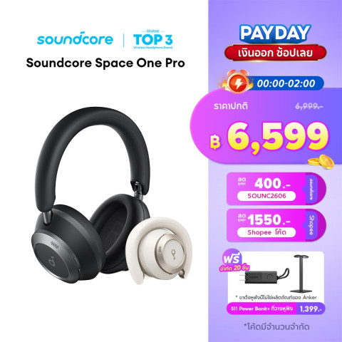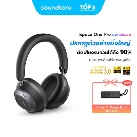 Soundcore Space One Pro Foldable Over-Ear Headphones (A3062) สีดำ หูฟังบลูทูธไร้สายแบบครอบหู ที่รวมความ “พับเล็ก พกง่าย” เข้ากับ “ตัดเสียงรบกวนขั้นเทพ” ให้คุณโฟกัสกับเพลง พอดแคสต์ หรือการประชุมได้ชัดเต็มอารมณ์ทุกที่ทุกเวลา พร้อมดีไซน์สวมสบายตลอดวัน และแบตอึดชาร์จไว เหมาะทั้งเดินทาง ทำงาน และใช้งานประจำวัน