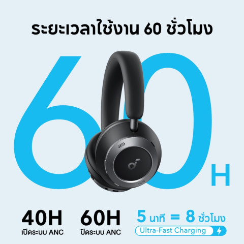 ใช้งานได้นานสูงสุด 40 ชั่วโมง (เปิด ANC) และ 60 ชั่วโมง (ปิด ANC) พร้อมชาร์จด่วนสุดคุ้ม ชาร์จ 5 นาที ฟังได้สูงสุด 8 ชั่วโมงสวมสบายยาวนาน