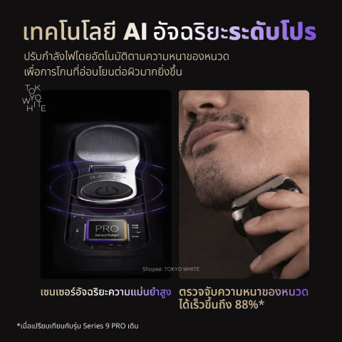อ่อนโยนต่อผิว ลดการเสียดสีจากการโกนซ้ำ พร้อมเทคโนโลยี PRO AI ตรวจจับความหนาหนวดได้ถึง 300 ครั้ง/วินาที และปรับกำลังอัตโนมัติ