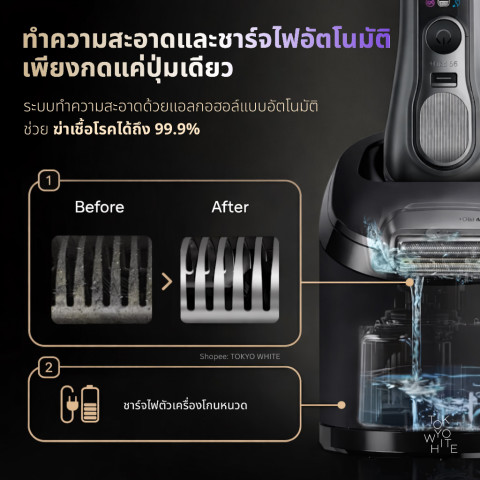 สะอาดเหมือนใหม่ทุกวัน เครื่องล้างแอลกอฮอล์อัตโนมัติ 5-in-1 ช่วยกำจัดแบคทีเรียได้ 99.9%* ดูแลหัวโกนให้พร้อมใช้งานเสมอ