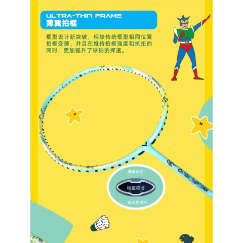 ไม้แบดมินตันรุ่นพิเศษลิมิเต็ดอิดิชั่นจาก VICTOR ซีรี่ส์ Crayon Shin-chan ดีไซน์โดดเด่น เหมาะสำหรับทั้งสายเล่นและสายสะสม โครงสร้าง Full Carbon น้ำหนักเบา ตอบสนองไว ช่วยเพิ่มความเร็ววงสวิง เล่นสนุก คุมเกมได้คล่องตัว เหมาะกับผู้ที่ชอบไม้สไตล์ Speed ที่เน้นความว่องไวในการบุกและโต้กลับ