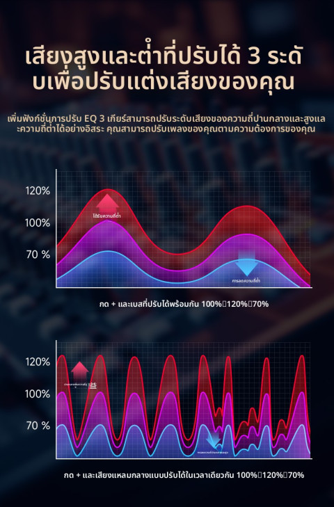อัตราส่วนสัญญาณต่อเสียงรบกวน (SNR): 80 dB ที่ 15W (กลาง-สูง); 80 dB ที่ 100W (ซับวูฟเฟอร์)