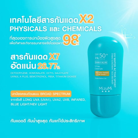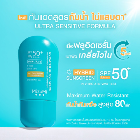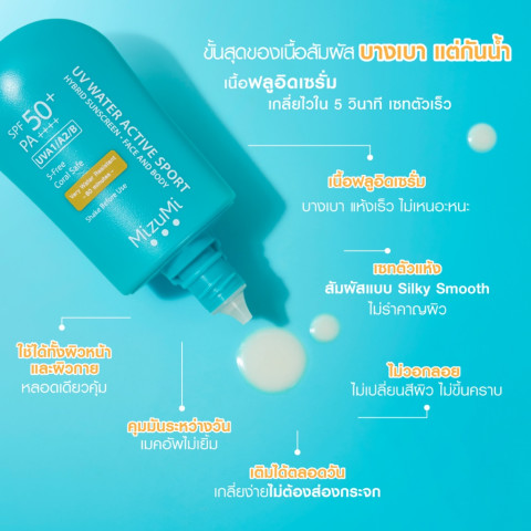 กันแดดสายสปอร์ตสำหรับคนชอบกิจกรรมกลางแจ้งโดยเฉพาะ! MizuMi UV Water Active Sport สูตรอัพเกรดใหม่ เนื้อบางเบา สบายผิว ไม่แสบตา แม้ต้องเผชิญแดดแรง เหงื่อออก หรือทำกิจกรรมต่อเนื่องกลางแจ้ง ให้การปกป้องผิวขั้นสูง พร้อมคุมมันและติดทนนาน แม้เล่นกีฬา ว่ายน้ำ หรือวิ่งกลางแดดก็เอาอยู่