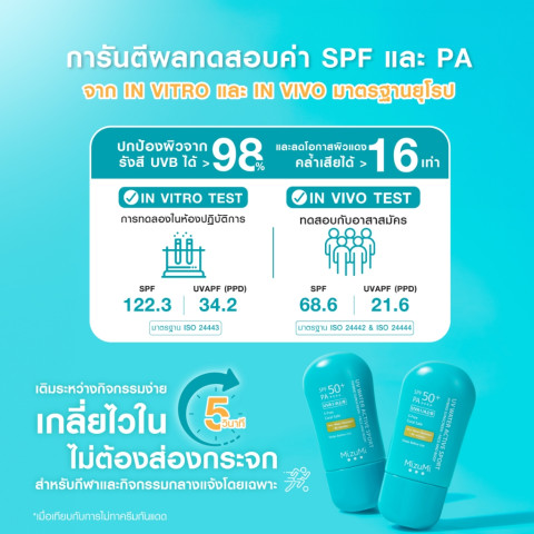 Hybrid Sunscreen SPF50+ PA++++ ปกป้องผิวจากรังสี UVA และ UVB ได้มากกว่า 98% (ทดสอบทั้ง In Vitro และ In Vivo ตามมาตรฐานยุโรป)