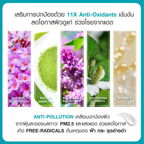 11X Anti-Oxidants อุดมด้วยสารสกัด Butterfly Bush, Matcha Green Tea, Vitamin E และสารสกัดแอนตี้ออกซิแดนท์จากญี่ปุ่น 8 ชนิด ช่วยลดโอกาสผิวถูกทำร้ายจากแสงแดดและมลภาวะ