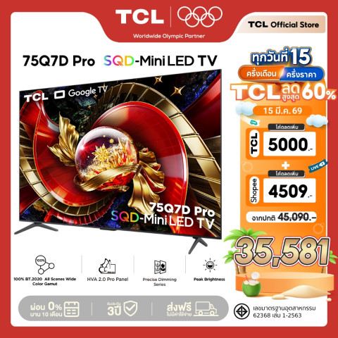 สัมผัสประสบการณ์ความบันเทิงเหนือระดับไปกับ NEW 2026 TCL ทีวี 75 นิ้ว 4K SQD Mini QLED Google TV รุ่น 75Q7D PRO ขนาดใหญ่จุใจ 75 นิ้ว มาพร้อมเทคโนโลยีจอภาพ HVA 2.0 Pro Panel และระบบภาพ 4K ความคมชัดสูง ผสาน Mini QLED ช่วยให้ภาพสว่างคมชัด สีสันสดจัดจ้าน คอนทราสต์ลึกดำเป็นดำ ดูหนัง ซีรีส์ หรือเล่นเกมก็เต็มอารมณ์ในทุกฉาก เหมาะทั้งห้องนั่งเล่นและโฮมเธียเตอร์ในบ้านของคุณ