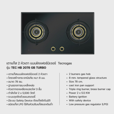 ยกระดับครัวของคุณให้สวยทันสมัยและใช้งานได้อย่างมืออาชีพด้วย TECNOGAS เตาแก๊ส 2 หัว รุ่น TEC HB 2078 GB turbo เตาแก๊สแบบฝังดีไซน์หรู ที่ผสมผสานพลังไฟแรง เปลวไฟสม่ำเสมอ และระบบความปลอดภัยครบครัน เหมาะทั้งสำหรับครัวบ้านและครัวสไตล์โมเดิร์นยุคใหม่