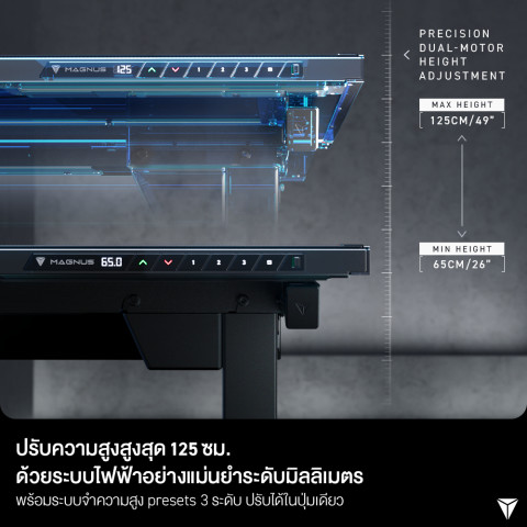 ระบบปรับความสูงไฟฟ้า ช่วงปรับ 65 – 125 ซม. ปรับยืน/นั่งได้อย่างราบรื่น