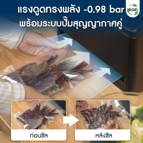 ใช้แถบซีลคู่ในห้องสุญญากาศและแถบซีลหนาสำหรับโหมดซีลไร้ฝา ช่วยให้แนวซีลแข็งแรง ลดโอกาสอากาศรั่วซึมแม้เก็บระยะยาว หรือผ่านการขนส่งหลายต่อปั๊มสุญญากาศคู่ แรงดูด -0.98 bar