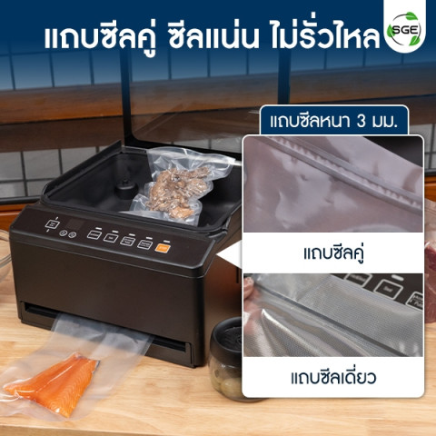 ซีลได้ทั้งของแห้ง ของเปียก ของเหลว และผงละเอียด หมดปัญหาการหกเลอะหรือดูดของเหลวเข้าระบบ เหมาะกับน้ำซุป ซอส น้ำสต๊อก เมนูซูวีด์ (Sous-vide) หรือเนื้อหมักต่าง ๆแถบซีลคู่หนา 3 มม. ยาว 30 ซม. ซีลแน่น ไม่รั่วซึม