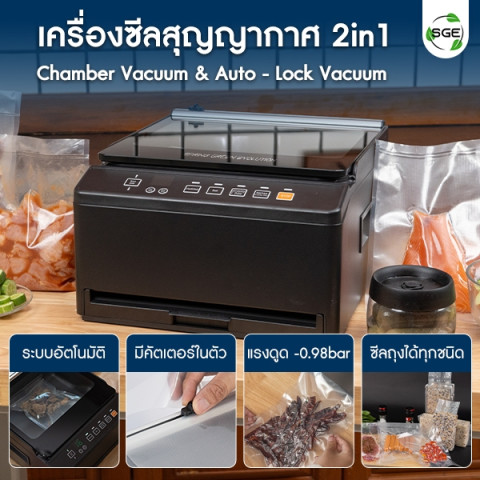 เครื่องซีลสูญญากาศ กึ่งอุตสาหกรรม รุ่น VC-CUBE แถบซีลคู่หนา 3 มม. คือผู้ช่วยตัวจริงในการยืดอายุวัตถุดิบทั้งในครัวเรือนและธุรกิจขนาดย่อม ผสานเทคโนโลยีห้องซีลสุญญากาศ (Chamber Vacuum) เข้ากับระบบซีลอัตโนมัติแบบไร้ฝา (Auto-Lock Vacuum) ในเครื่องเดียว ซีลได้ทั้งของแห้ง ของเปียก ของเหลว และผงละเอียดอย่างมั่นใจ ซีลแน่น ไม่รั่วซึม ช่วยรักษาความสด ลดการเกิดเชื้อรา ลดกลิ่นและการปนเปื้อน เก็บได้นานขึ้นอย่างคุ้มค่า
