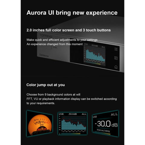 มาพร้อมโหมดเสียงให้เลือกถึง 3 รูปแบบ ได้แก่ NOS, OS และ Best รองรับทั้งสายฟังตรงเน้นความดิบธรรมชาติ และสายปรับแต่งเสียงที่ต้องการความละเอียดสูงสุด พร้อม Aurora UI ใหม่ล่าสุด หน้าจอสัมผัสสี 2.0 นิ้ว ใช้งานง่าย ปรับตั้งค่าได้สะดวก และสามารถเลือกสีพื้นหลังได้ถึง 9 สี รวมถึงแสดงผลแบบ FFT, VU และหน้าจอเล่นเพลงได้ตามสไตล์ของคุณ