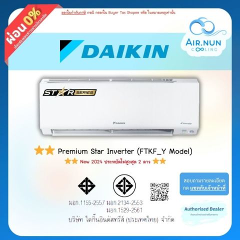 ส่งฟรี แอร์ไดกิ้น Daikin Star Max Inverter 2 ดาว (KF) CAZ Coil รุ่นใหม่อินเวอร์เตอร์ เบอร์ 5 ครบชุด+ท่อ สเปค FTKF24Y⭐⭐ ขนาด 24,200 BTU เหมาะสำหรับห้องขนาดใหญ่หรือห้องรับแขก ที่ต้องการความเย็นเร็ว ประหยัดไฟ และใช้งานทนทานยาวนาน มาพร้อมคอมเพรสเซอร์อินเวอร์เตอร์แท้ เน้นการประหยัดพลังงาน และป้องกันไฟกระชากได้ดี
