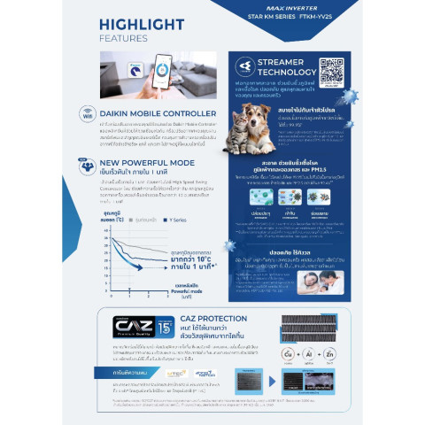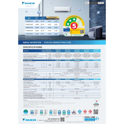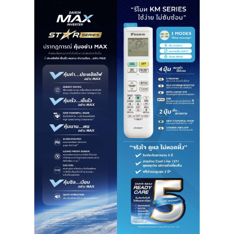 รุ่นนี้โดดเด่นด้วยค่า SEER สูง เบอร์ 5 การันตีความประหยัดไฟ พร้อมเทคโนโลยีล้ำสมัยจาก DAIKIN ที่ออกแบบมาเพื่อสภาพอากาศและการใช้งานจริงในบ้านเรา ทั้งประสิทธิภาพการทำความเย็นที่เร็ว เงียบ ทนทาน และปลอดภัย