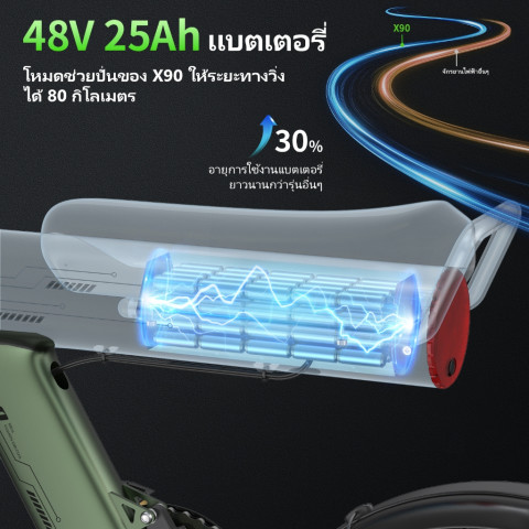 แบตเตอรี่ลิเธียม 48V ความจุสูง (ประมาณ 14–25Ah) ให้ระยะทางวิ่งได้ไกลถึง 80–120 กม. ในโหมดช่วยปั่น และราว 60 กม. ในโหมดไฟฟ้าล้วน ต่อการชาร์จหนึ่งรอบ ใช้เวลาในการชาร์จประมาณ 6–8 ชั่วโมง เหมาะสำหรับการเดินทางไปทำงาน ไปเรียน หรือขี่เล่นในวันหยุดโครงสร้างแข็งแรง รองรับน้ำหนักได้มาก