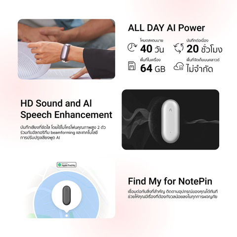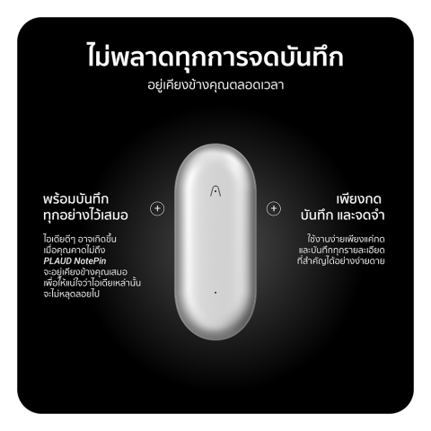 PLAUD NotePin คือผู้ช่วย AI ขนาดจิ๋วที่สามารถหนีบเสื้อหรือพกติดตัวไปได้ทุกที่ บันทึกทุกเสียงสนทนาอย่างคมชัด แล้วส่งต่อให้ระบบ AI ช่วยถอดเสียงและสรุปประเด็นสำคัญให้พร้อมใช้งานในไม่กี่ขั้นตอน ลดภาระการจดโน้ตเอง ให้คุณมีสมาธิอยู่กับการสนทนาและการตัดสินใจได้เต็มที่