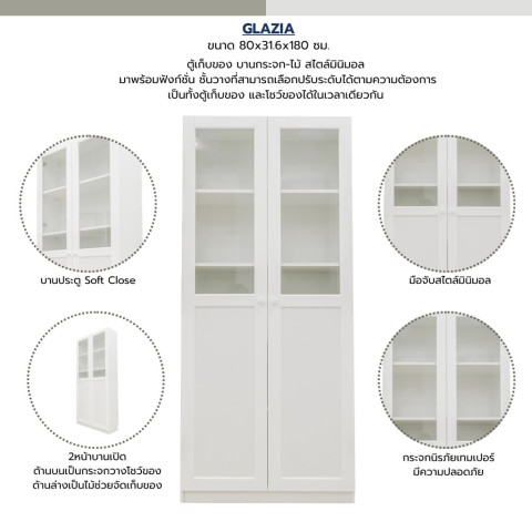 ตู้โชว์ GLAZIA มาพร้อมโทนสีขาวสะอาดตา หน้าบานกระจกนิรภัยเทมเปอร์ช่วยโชว์ของสะสมหรือของตกแต่งโปรดได้อย่างปลอดภัย ส่วนบานล่างเป็นไม้สำหรับเก็บของใช้ที่ไม่ต้องการตั้งโชว์ ช่วยให้ห้องดูเป็นระเบียบมากขึ้น บานประตู Soft Close ปิดนุ่มนวล ไม่กระแทก ลดเสียงรบกวนและช่วยยืดอายุการใช้งาน จับคู่กับมือจับดีไซน์มินิมอลที่เข้าได้กับทุกสไตล์การแต่งห้อง