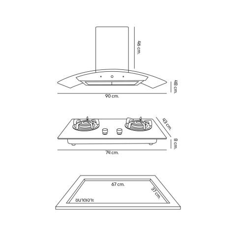 ขนาดโดยรวมเครื่องดูดควัน: กว้าง 90 ซม. x ลึก 48 ซม. x สูง 46 ซม.