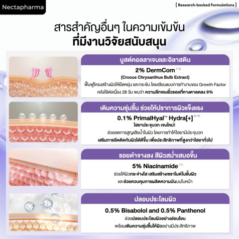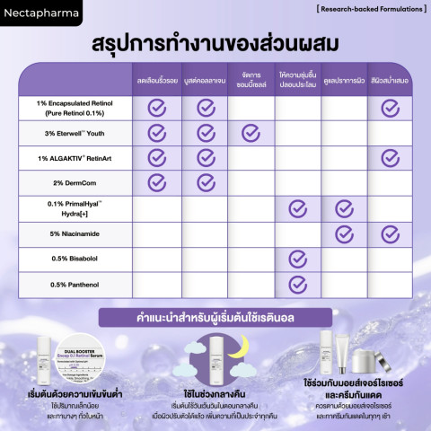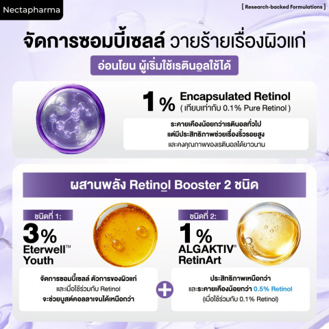Nectapharma Dual Booster Encap 0.1 Retinol Serum (เนคตาฟาร์มา ดูอัล บูสเตอร์เอนแคป 0.1 เรตินอล เซรั่ม) เซรั่มเรตินอลสูตรวิจัยโดย Nectapharma Research ที่ออกแบบมาเพื่อผู้เริ่มต้นใช้เรตินอลอย่างมั่นใจ ด้วย Encapsulated Retinol 0.1% (Pure Retinol) ที่ช่วยเพิ่มความเสถียรและลดโอกาสระคายเคือง พร้อมผสาน “บูสเตอร์” 2 ชนิดเพื่อผลลัพธ์ด้านริ้วรอยที่เหนือกว่าการใช้เรตินอลเดี่ยว ช่วยให้ผิวดูเรียบเนียน ยืดหยุ่น กระชับ และชุ่มชื้นขึ้นอย่างเป็นธรรมชาติ