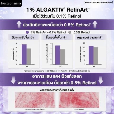 1% ALGAKTIV® RetinArt ทำงานร่วมกับ 0.1% Retinol ให้ผลลัพธ์เหนือกว่า 0.5% Retinol ทั้งความกระชับ ริ้วรอย จุดด่างดำ และลดโอกาสผิวแสบ แดง แห้งลอก