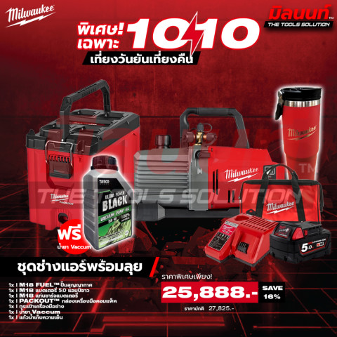 Milwaukee - 9.9 ชุดช่างแอร์พร้อมลุย เซ็ตจัดเต็มสำหรับงานติดตั้งและซ่อมบำรุงระบบปรับอากาศ/ทำความเย็น พร้อม ปั๊มสุญญากาศไร้สาย M18FVP5-0 (เครื่องเปล่า) ทำงานคล่องตัว ไม่ต้องลากสายไฟให้เกะกะหน้างาน จับคู่กับ กล่องเครื่องมือ PACKOUT™ Compact Tool Box แข็งแรง จัดเก็บและขนย้ายเป็นระเบียบ พร้อมอุปกรณ์จำเป็นครบชุด ใช้งานได้ทันที เหมาะทั้งช่างมืออาชีพและทีมงานที่ต้องการความเร็วและความพร้อมทุกสถานการณ์