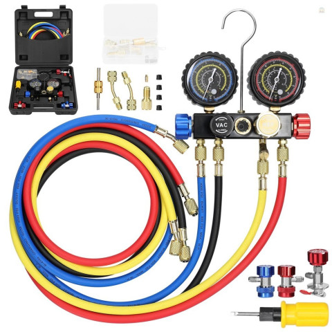 Manifold Gauge ชุดเครื่องมือชาร์จน้ำยาแอร์ 4-Way Dual-Value ออกแบบมาเพื่อช่างและผู้ใช้งานที่ต้องการตรวจวัดแรงดันและเติมสารทำความเย็นได้อย่างแม่นยำ ครอบคลุมการใช้งานกับระบบทำความเย็นหลากหลายประเภท รองรับทั้งงานซ่อมบำรุง ตรวจเช็ก และวินิจฉัยอาการได้อย่างมั่นใจ ในชุดมาพร้อมท่อ 5 ฟุต ข้อต่อทองเหลือง และ Quick Coupler ใช้งานสะดวก พร้อมอะแดปเตอร์สำหรับ R22/R134a/R410a ในกล่องเดียว