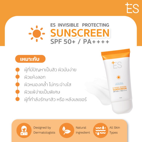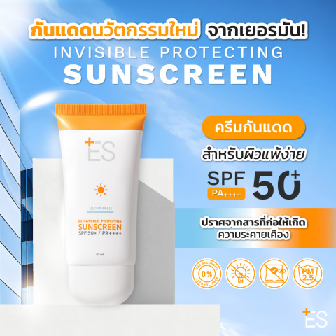 ES Invisible Protecting Sunscreen SPF50+ PA++++ 30ml กันแดดเนื้อบางเบาแบบ Invisible ซึมไว ไม่เหนียวเหนอะหนะ เหมาะสำหรับผิวบอบบางแพ้ง่ายและผิวเป็นสิว ใช้ได้ทุกวันทั้งในเมืองและกิจกรรมกลางแจ้ง พร้อมช่วยดูแลสมดุลผิว เติมความชุ่มชื้น และเสริมเกราะปกป้องผิวให้ดูแข็งแรงสุขภาพดี