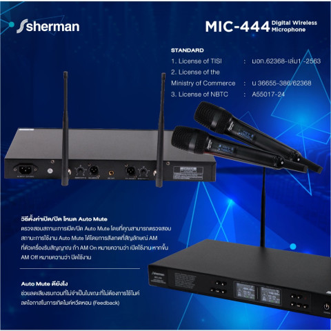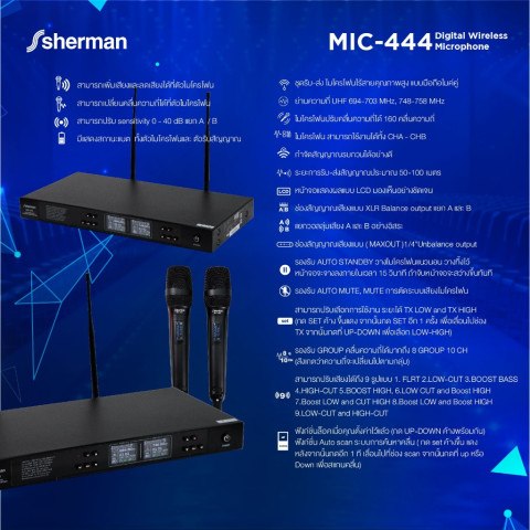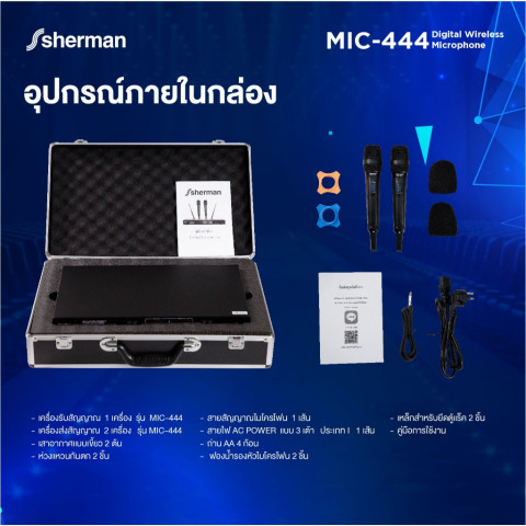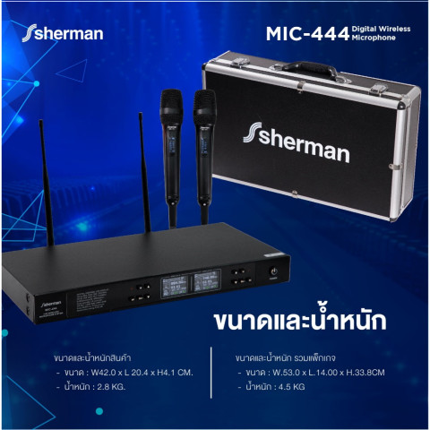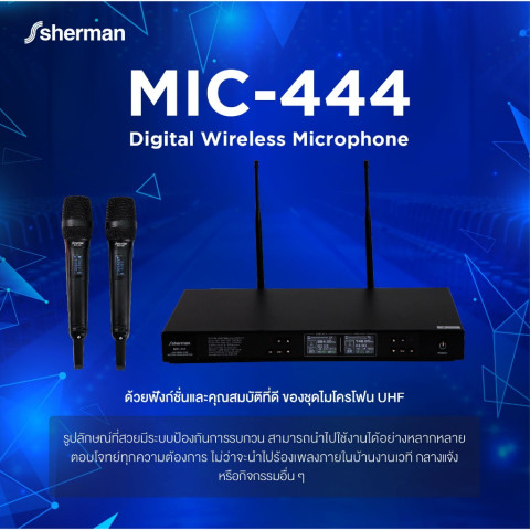 Sherman ชุดไมโครโฟนไร้สาย UHF รุ่น MIC-444 (Digital Control) ทางเลือกสำหรับงานเสียงที่ต้องการความคมชัดและเสถียรทั้งในบ้านและงานอีเวนต์ ด้วยไมโครโฟนมือถือ “ไมค์คู่” ปรับคลื่นได้มากถึง 160 ช่องความถี่ พร้อมระบบลดสัญญาณรบกวน ช่วยให้ใช้งานได้มั่นใจทั้งร้องเพลง งานเวที กลางแจ้ง หรือกิจกรรมต่างๆ ในระยะรับ-ส่งประมาณ 50-100 เมตร