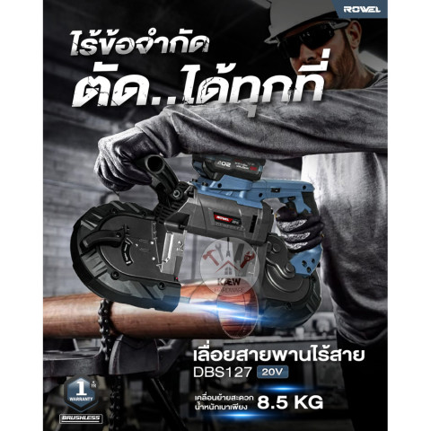ROWEL เลื่อยสายพานไร้สายพร้อมฐาน 20V รุ่น DBS127/S ครบชุดพร้อมใช้งานทันที (รวมแบตเตอรี่ 4.0Ah และแท่นชาร์จ) ในราคา 9,000.00 บาท เหมาะทั้งช่างมืออาชีพและสาย DIY ที่ต้องการงานตัดที่รวดเร็ว เรียบเนียน และปลอดภัยกว่า ด้วยการตัดแบบ ไม่มีประกายไฟ เคลื่อนย้ายสะดวกเพราะเป็นระบบไร้สาย ใช้งานได้แม้ในพื้นที่ไม่มีไฟฟ้า