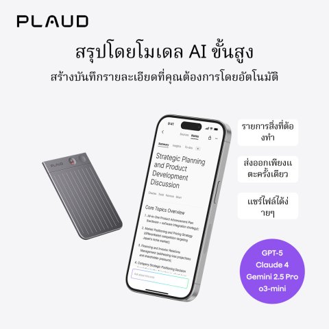 [Official] Plaud Note AI เครื่องบันทึกเสียง AI Note Taker ผู้ช่วยจดบันทึกยุคใหม่ที่พัฒนาอยู่บนโมเดล AI ชั้นนำ (GPT-4.1 / o3-mini / Claude Sonnet / Gemini 2.5 Pro) ครบตั้งแต่ บันทึกเสียง → ถอดความ → สรุปผล เหมาะสำหรับการประชุม การบรรยาย การสัมภาษณ์ และการบันทึกสายสนทนา ช่วยเปลี่ยนเสียงให้กลายเป็นข้อมูลที่ใช้งานได้จริงภายในไม่กี่นาที