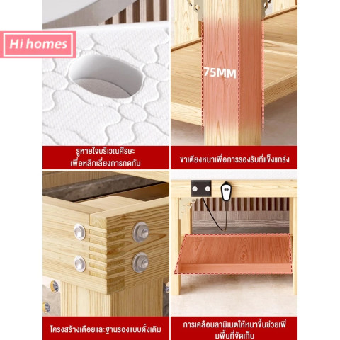 โครงสร้างทำจากไม้สน Pinus Sylvestris นำเข้า ผ่านการอบแห้งอุณหภูมิคงที่ ความชื้นต่ำ ลดโอกาสบิดงอ/แตกร้าว ให้ความมั่นใจในการรองรับการใช้งานหนักต่อเนื่องมีชั้นเก็บของหนา 5 ซม. เพิ่มพื้นที่จัดเก็บ