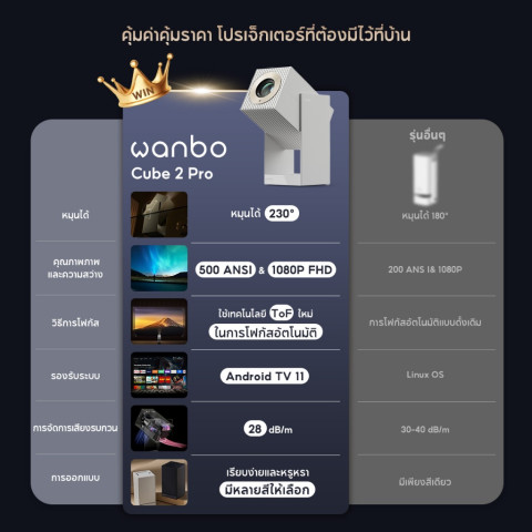 [NEW] Wanbo Cube 2 Pro 500 ANSI Projector 230° Rotating โปรเจคเตอร์อัจฉริยะที่ครบทั้งภาพคมชัด เสียงรบกวนน้อย และใช้งานง่ายแบบ “เปิดแล้วดูได้เลย” ด้วย Android TV 11.0 ดาวน์โหลดแอปฯ ได้กว่า 7,000+ พร้อมหมุนตัวเครื่องได้อิสระถึง 230° จะฉายผนัง โต๊ะ หรือเพดานก็ทำได้สบาย เหมาะทั้งดูหนัง เล่นเกม ประชุม และทำโฮมเธียเตอร์ในห้องนอน